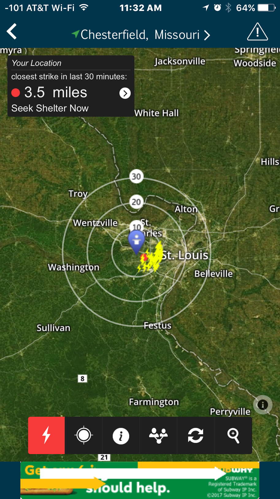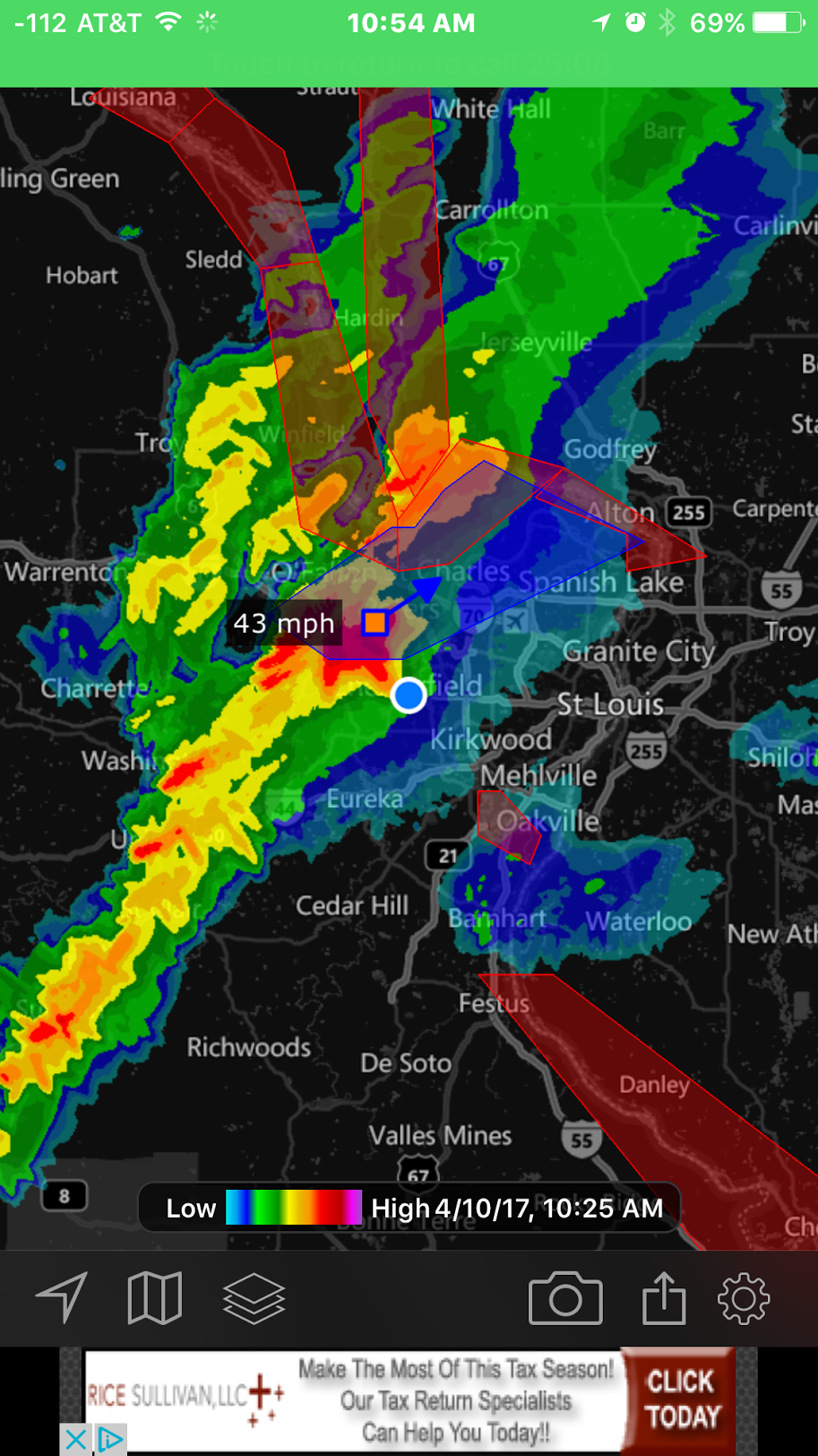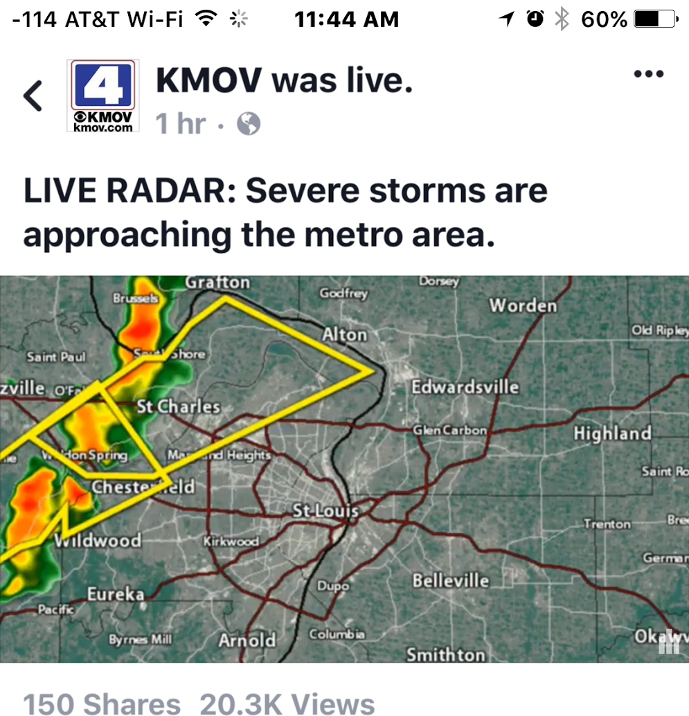 Most local TV stations stream severe weather coverage through their website, app, or as one of the St. Louis stations did today, through Facebook. It took TV stations a little while to figure out that if you’re hiding in the basement during a storm, you may not have access to a TV, but they’ve largely gotten their act together and make their severe weather coverage easy to find. This was a feed of the station’s radar, but you can usually find full coverage with a meteorologist on the station’s app, often when the coverage isn’t being broadcast. Just about all TV apps are free, so you can easily download apps from all the stations in your market and see who does the best job.