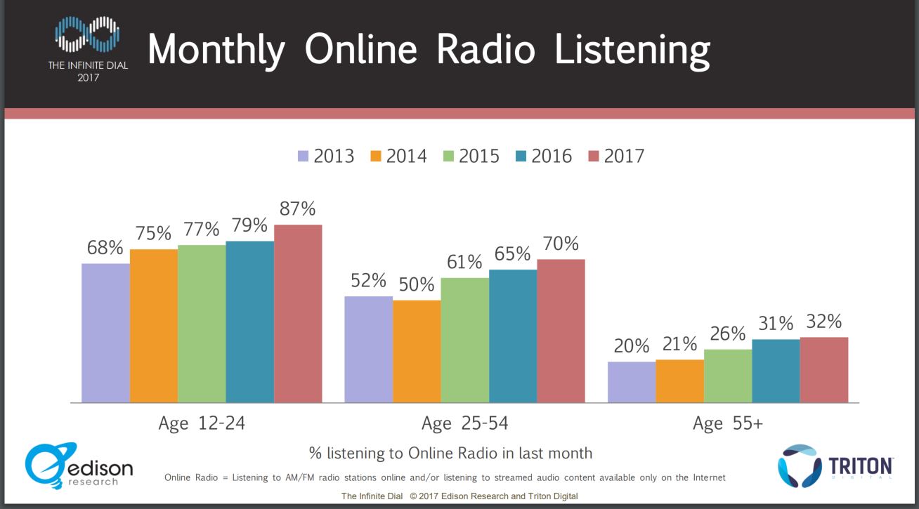Finally, the crux of the Larry Miller study that so many in radio are trying to discredit. According to The Infinite Dial, there is a stark difference in both the amount of online “radio” listening and the growth of that listening among different demographic groups, and younger peoples’ listening is growing. The younger the group, the more audio they consume online. But almost a third of people 55+ are listening online as well. And since the number of hours in their days aren’t expanding that most likely means less listening to AM and FM.