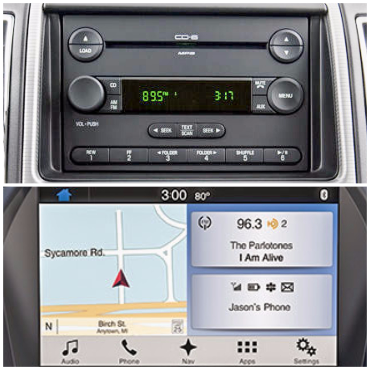 First, radio no longer has an exclusive hold on what has been its most powerful delivery method, the automobile dashboard. As recently as ten years ago, most cars came standard with an AM/FM radio, usually with a CD or cassette player built in. Now, radio is just one of many choices sharing a touchscreen in the center of the dashboard, putting it on an equal playing field with everything from satellite radio to on-demand music services to podcasts, not to mention almost any app on a user’s smartphone. The image on top is a 2007 Ford radio. On the bottom is the screen of the Ford Sync system in their 2017 models.