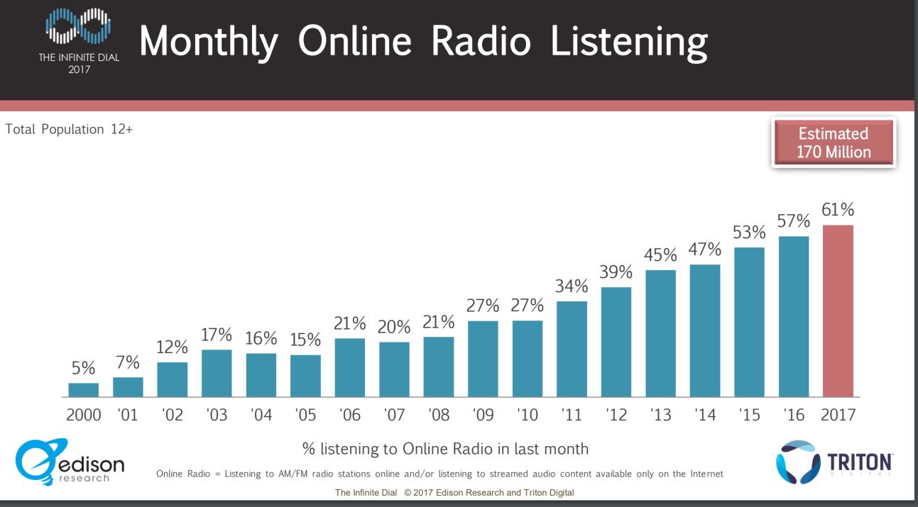 Second, there’s no argument that more people are consuming audio online, whether it’s streaming audio from a radio app like iHeartRadio or a standalone streaming service like Spotify. Even the Nielsen radio ratings quoted in the Cumulus/Westwood One article above include broadcast AND online listening of stations who choose to add their on-air and online listening together for something they call Total Line Reporting. Edison Research’s Infinite Dial Study, considered the “gold standard” measurement of audio consumption, shows the growth of “online radio listening”, which basically means any real-time sound coming out of a speaker or headphones It also includes mobile devices, which continue to gobble up more and more online listening. So any live streaming of a radio station or listening to a music service stream is part of this chart, podcasts are not. And all of this data only shows listening, not revenue generated from that listening. The real revenue in audio is still with AM/FM broadcasting. We’re still some time away from making real money from streaming or satellite radio ads.