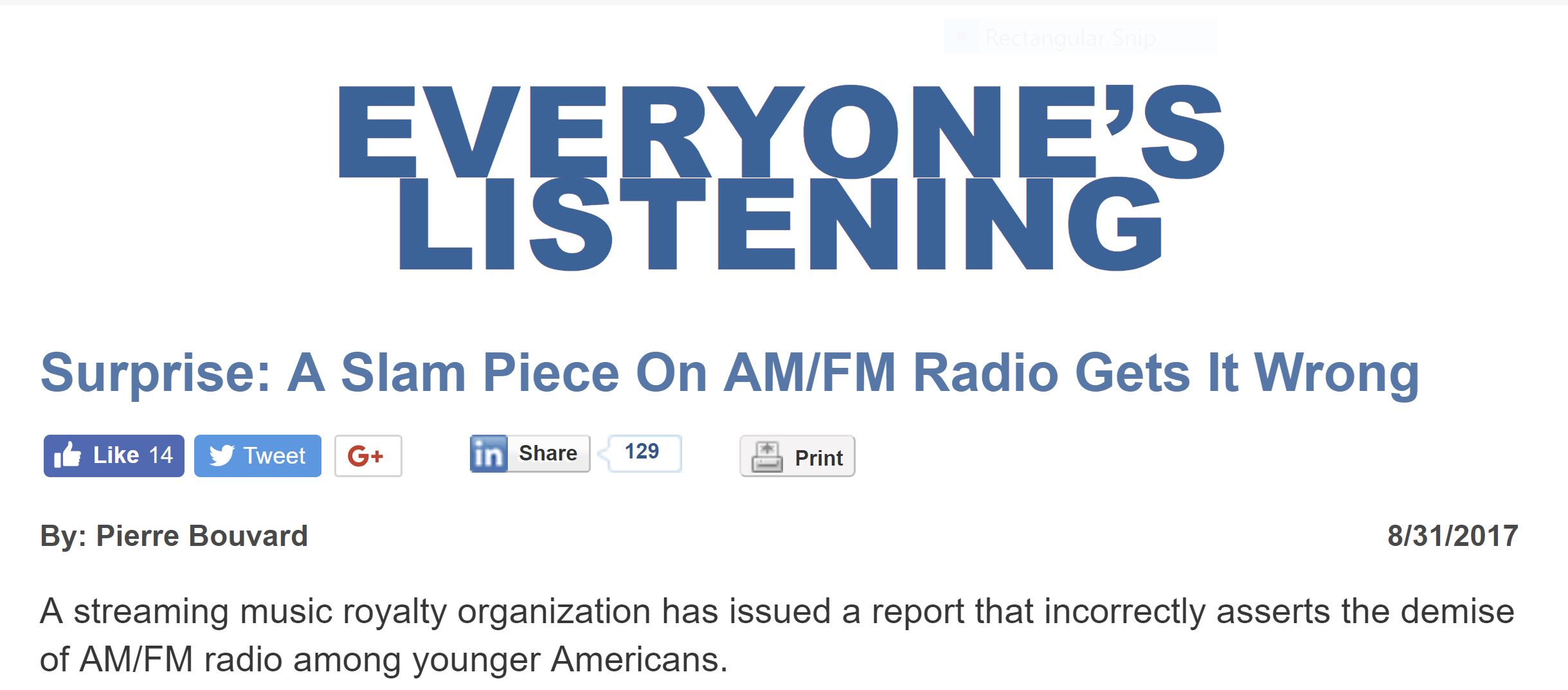 Cumulus/Westwood One, one of the three largest companies in the radio industry. The post is full of charts and graphs that (understandably) show how strong the radio industry is and trying to debunk just about everything in the study that started this brouhaha. Like the NAB’s Wharton, he minces no words in his opposition to the findings of the study and everything about it. If you can trust the data source, the much maligned Nielsen Portable People Meter used in 48 of the 268 Nielsen radio markets, there are some interesting arguments made in the post.